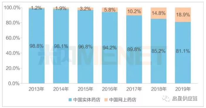 2013-2019年中国实体药店和网上药店(含药品和非药品)销售额占比