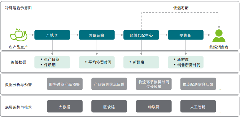 生鲜行业近年来发展迅猛,坐拥万亿级别市场体量。但生鲜产品零售商面临着冷链物流与库存管理环节带来的生鲜产品损耗和质量风险。在冷链物流环节,冷链物流温度记录实时性较差,多为自动采集、人工记录,易产生偏差,甚至存在作假与虚报。在库存管理端,当前仓储管理方式极大依赖人工对于变质过期生鲜产品的库存盘点,耗时耗力,难以实时根据生鲜产品新鲜程度及销售情况对仓储和上架进行调整。