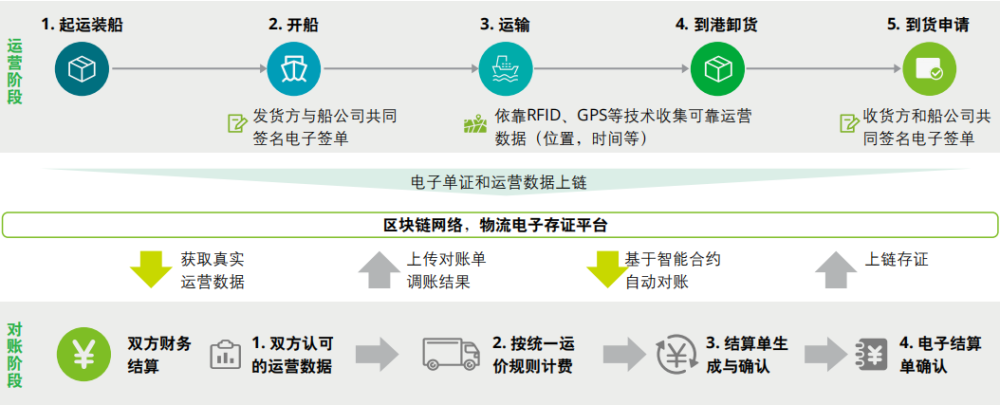 如今通过将包含运价规则的电子合同写入区块链,结算双方共享同一份双方认可的交易数据和运价规则,在交易发生时,业务相关方可通过区块链平台进行基于智能合约的自动对账和结算单自动生成与确认,实现交易即清算。