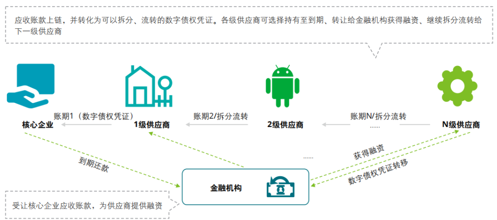 供应链金融:依靠区块链技术保证交易背景可信赖、链主企业信用可穿透、债权凭证可分拆,解决供应链末端中小微企业融资难题。