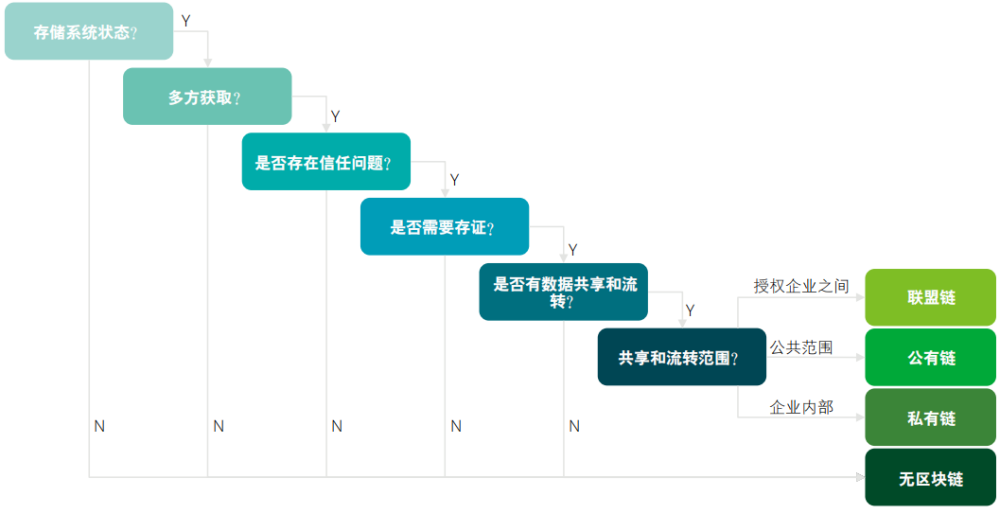 决定区块链部署模式,打出区块链建设组合拳:不同业务场景对区块链性能、治理模式等有不同要求。企业应充分了解各场景适用的区块链部署模式,确定最优选择,打出组合拳。企业可以通过一系列的决策路径来判断是否在某个场景中使用区块链技术,以及具体的区块链部署形式。(如图12:区块链决策树)
